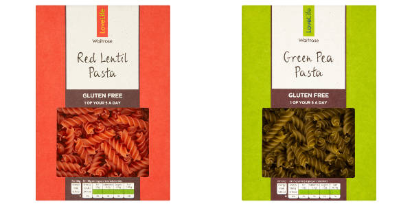 Ce sont en effet deux nouvelles variétés de fusilli gluten-free que vient de lancer Waitrose sous sa propre marque, LoveLife. Les premières sont fabriquées avec de la farine de lentilles corail, d’où leur belle teinte rouge. Les secondes, presque brunes, avec de la farine de petits pois. La couleur de l’emballage est assortie à celle du produit qu’il contient et jusque-là, rien de très original. Cependant, le conditionnement de ces pâtes recèle un petit secret, invisible à l’œil nu.